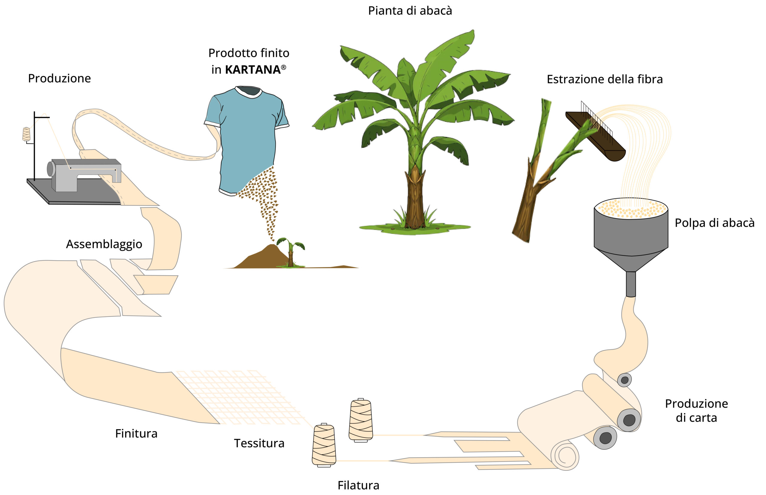 Il filato KARTANA® nasce dalla pianta di abacà e intraprende un viaggio armonioso, ispirato ai ritmi della natura. Ogni fase del suo ciclo di vita – dalla coltivazione alla trasformzaione, fino al riuso – esprime un autentico impegno per l’innovazione responsabile e il rispetto dell’ambiente.